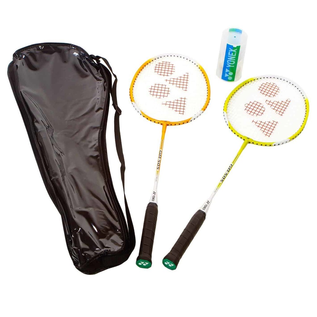 Цей набір включає 2 ракетки Yonex GR505 жовтого та помаранчевого кольору, 2 пластикових воланчика жовтого кольору з пробковою головкою. А ще 2 намотки у подарунок – все для комфортної гри!
